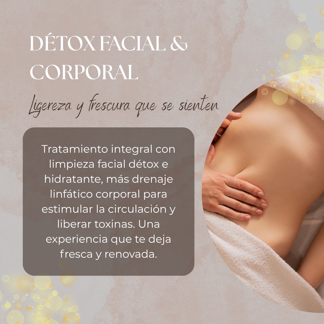 Un tratamiento integral que limpia y revitaliza desde el rostro hasta el cuerpo. Comienza con una limpieza facial detox que purifica e hidrata la piel, seguida de un drenaje linfático manual en una zona corporal, ideal para estimular la circulación y liberar toxinas. Una experiencia perfecta para sentirte más liviana, fresca y renovada.